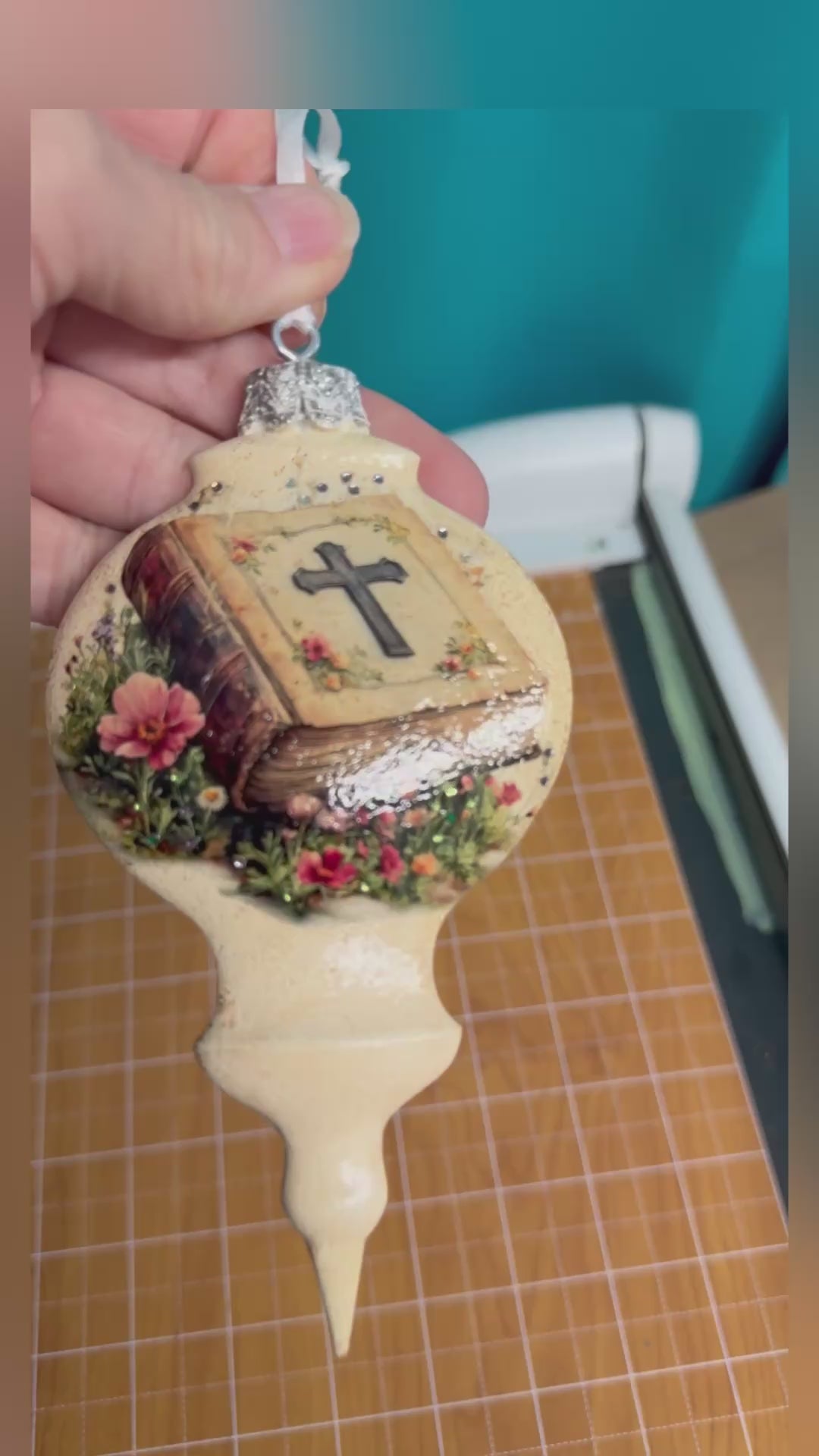 A decorative ornament featuring a cross on a book, placed on a wooden surface.