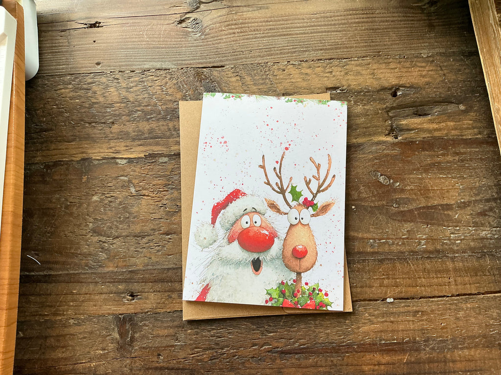 Celebrate the holiday season with this charming 5x7 greeting card featuring a whimsical illustration of Santa and his reindeer. The vibrant colors and playful design bring a festive spirit to your holiday greetings. This blank card provides ample space for your personal message, making it perfect for sharing warm wishes with friends and family. Crafted from high-quality cardstock, it offers a sturdy feel and a smooth writing surface. Whether you're sending it as a holiday card or using it for a special occasion, this delightful card is sure to spread joy and cheer.
